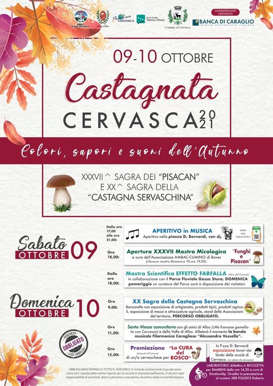 Sabato 9 e domenica 10 ottobre a Cervasca, piccolo comune alle porte di Cuneo, prenderà il via la due giorni con XXXVII^ Sagra dei PISACAN e la XX^ Sagra della CASTAGNA SERVASCHINA.