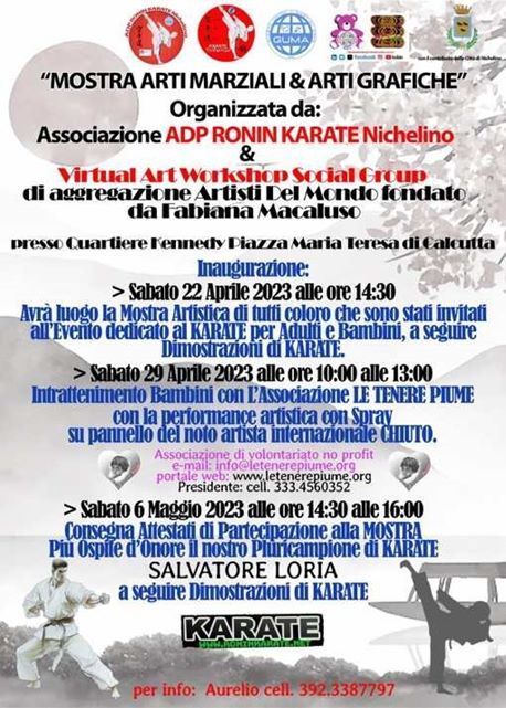 “ARTI MARZIALI E ARTE GRAFICA” con performance di Karate da parte dei bambini presso il Quartiere Kennedy e allestimento su griglie delle opere grafiche a tema del gruppo di aggregazione artistica del Progetto Internazionale Virtual Art Workshop Social Group, fondato da Macaluso