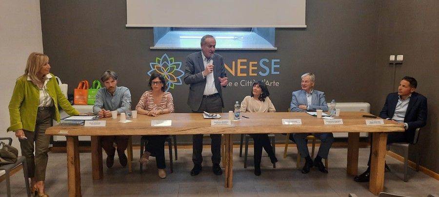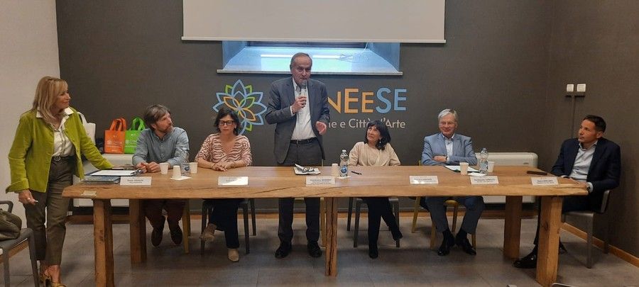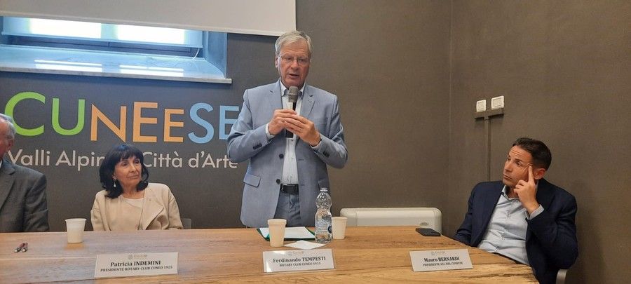 Al tavolo dei relatori la consigliera Atl Gabriella Giordano (che è anche socia Rotary Club Cuneo), il presidente Atl Mauro Bernardi, il presidente della Fondazione CRF Gianfranco Mondino, la presidente del Rotary Club Cuneo 1925 Patricia Endemini insieme a Ferdinando Tempesti, il regista Paolo Ansaldi e la storica dell'arte Laura Marino.