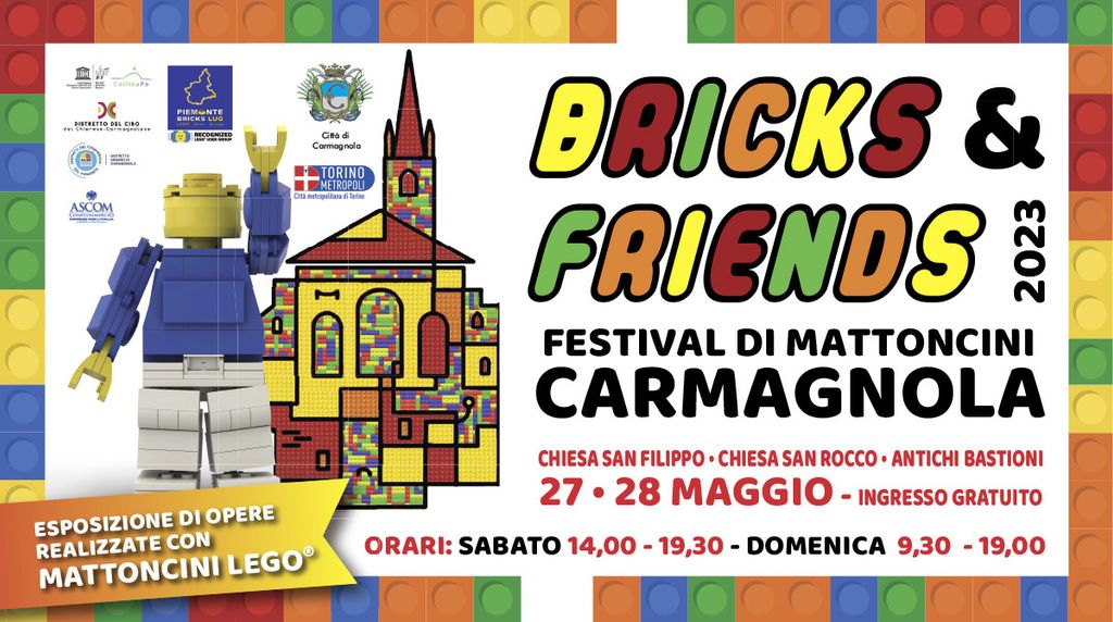 Una nuova manifestazione, con ingressi gratuiti alle esposizioni, alle aree ludiche e ai laboratori, organizzata dal Comune di Carmagnola in collaborazione con Piemonte Bricks LUG, primo ‘user group’ piemontese ufficialmente riconosciuto, con il patrocinio della Città Metropolitana di Torino, insieme a tanti appassionati carmagnolesi e non solo, con il sostegno di Allianz Assicurazioni di Pioli-Gazzera-Gianotti, Pasta Berruto, Fratelli Donna Ferramenta, Elledì arti grafiche, BTM – Banca Territori del Monviso e ECS – Movimentazione industriale e magazzini automatici.