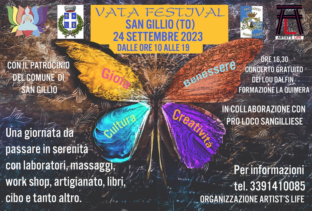 Domenica 24 settembre 2023, dalle 10 alle 19 con il Patrocinio del Comune di San Gillio e in collaborazione con la Pro Loco Sangilliese si svolgerà il Vata Festival, una giornata all’insegna del benessere, della gioia, della creatività e della cultura. Un’occasione per praticare discipline olistiche e per conoscere nuove realtà e prodotti artigianali.