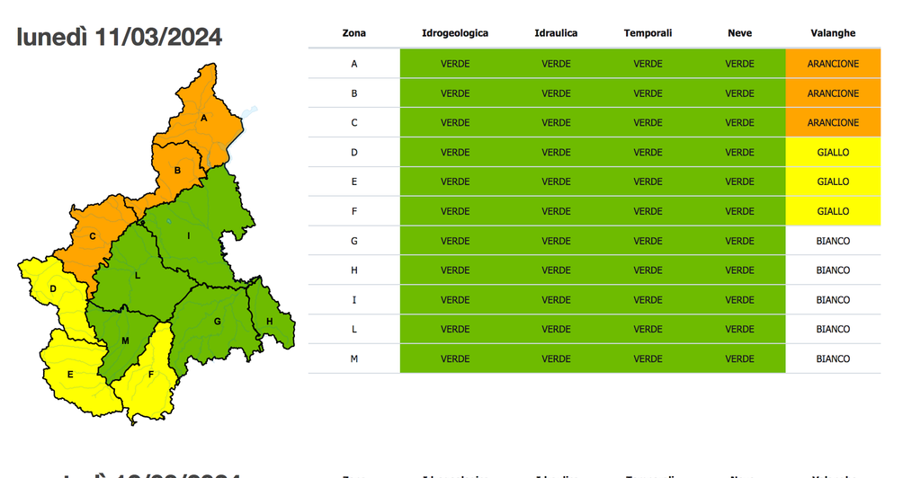 Scende a “marcato” solo in alcune aree delle Alpi Cozie. Occorre ad ogni modo prestare la massima attenzione viste le cospicue precipitazioni degli ultimi giorni. Nel resto del Piemonte l'allerta gialla è stata emessa per oggi sulle Valli Po, Infernotto, Varaita, Maira, Stura e Valle Tanaro.