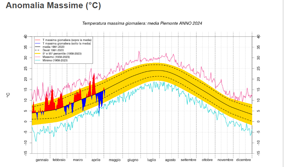 Ma tutto questo non basta. Anche all'occhio più distratto non può sfuggire come, dall'inizio del 2024 a oggi, siano molte di più le situazioni in cui le temperature sono schizzate verso l'alto. Molto verso l'alto. E' ancora lo schema statistico di Arpa Piemonte a spiegare la situazione: tutto febbraio, ma anche buona parte di gennaio e marzo hanno regalato massime decisamente superiori alla media. Così come la parte centrale di marzo e la prima metà di aprile.