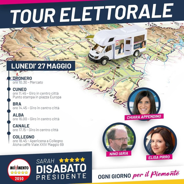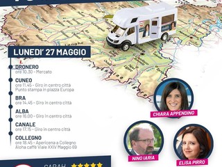 Il tragitto di oggi comprende Dronero, Cuneo, Alba, Bra e Canale, prima del rientro serale a Collegno. Ma il tragitto durerà due settimane, toccando tutte le province del Piemonte. "Dalla Sanità al trasporto pubblico, vogliamo raccontare le nostre ricette per migliorare la situazione. Senza dimenticare il tema del lavoro", dice la candidata Cinque Stelle.