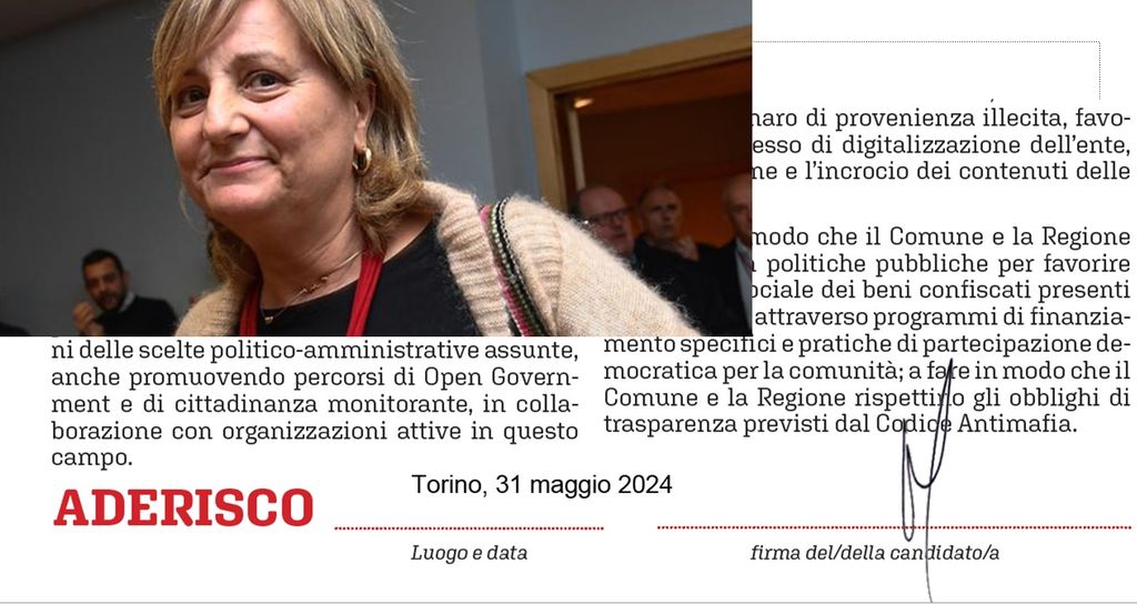 Avviso Pubblico e Libera lanciano un appello ai candidati alle elezioni dell'8-9 giugno, per Comunali, Regionali Europee. Un documento sottoscritto da decine di candidati, ma anche da quattro dei cinque aspiranti governatori del Piemonte: Alberto Cirio del centrodestra, Gianna Pentenero per il centrosinistra, Sarah Disabato per il Movimento 5 stelle e Francesca Frediani per Piemonte Popolare.