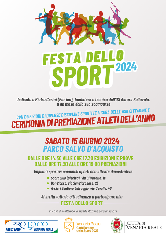 A Venaria è tutto pronto per l'Edizione del 2024 della "Festa dello Sport", che sarà dedicata a Pietro Casini (Pierino) tecnico e fondatore dell'US Aurora Pallavolo di Venaria Reale.