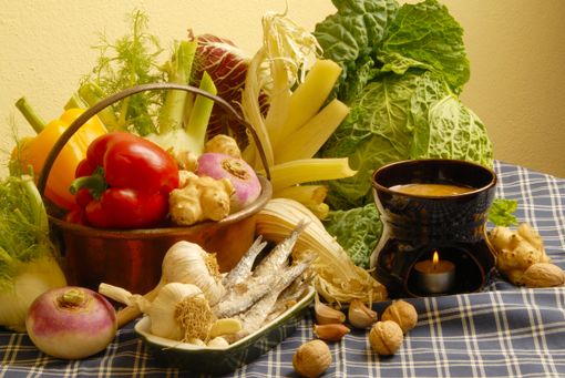 È un piatto della tradizione e della convivialità diffuso nel mondo ovunque vi siano piemontesi. Un intingolo caldo di olio, acciughe e aglio che accoglie ogni tipo di verdura dell’orto, “pucciate” nel fujot e accompagnate da pane e vino. Ci sono i cardi, ma anche i cavoli, le rape, la biarava rossa, le patate e le cipolle bollite, i porri e topinambur etc. La Bagna Cauda ha accompagnato gli inverni di decine di generazioni contadine. È un rito antico tornato attuale con l’aggiunta di un ingrediente: l’ironia.