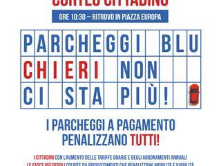 L’appuntamento è per sabato 1° marzo alle ore 10.30 in Piazza Europa, luogo di partenza della manifestazione di contestazione dal titolo “Parcheggi blu Chieri non ci sta più”. Il corteo percorrerà via Vittorio Emanuele, Piazza Cavour, Via Palazzo di Città snodandosi fino all’arrivo innanzi al Municipio ove avranno luogo il raduno e le dichiarazioni di partecipanti e organizzatori.