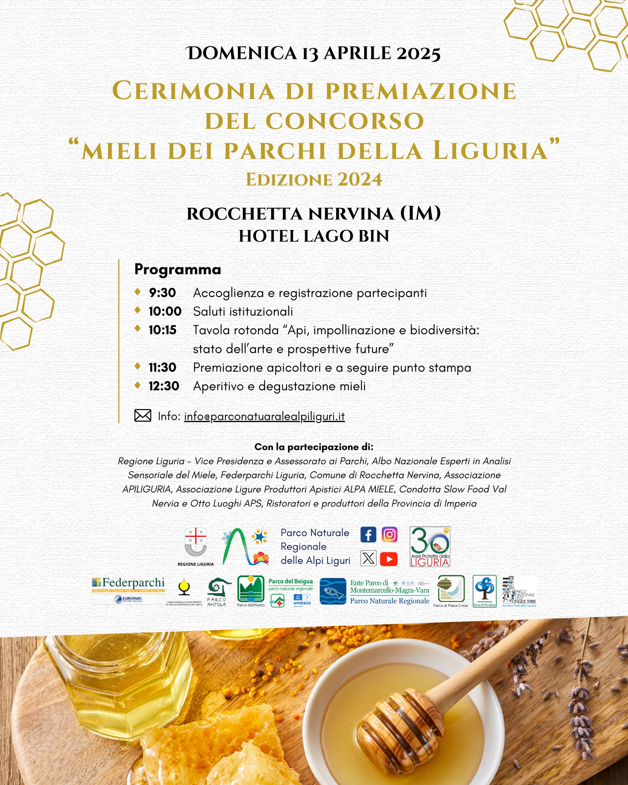 Con la partecipazione di: Regione Liguria - Vice Presidenza e Assessorato ai Parchi, Albo Nazionale Esperti in Analisi Sensoriale del Miele, Federparchi Liguria, Comune di Rocchetta Nervina, Associazione APILIGURIA, Associazione Ligure Produttori Apistici ALPA MIELE, Condotta Slow Food Val Nervia e Otto Luoghi APS, Condotta Slow Food Riviera dei Fiori Alpi Marittime, ristoratori e produttori della Provincia di Imperia