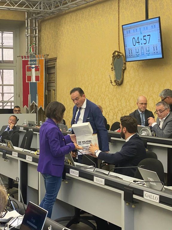 E dopo lo scontro di questa mattina con il consigliere regionale del Pd Mimmo Rossi, l'assessore alla Sanità Federico Riboldi è stato di nuovo oggetto di un attacco. La capogruppo del M5S Sarah Disabato ha consegnato all'esponente della giunta una scatola piena di “gettoni” di carta. "Lo abbiamo fatto per denunciare la deriva di questa Giunta, capace nel 2024 - come attestato dalla Corte dei Conti, che ha bacchettato la Regione - di spendere oltre 115 milioni di euro per le cooperative di gettonisti, addirittura di più della vicina Lombardia" hanno commentato Disabato, con i colleghi Unia e Coluccio.