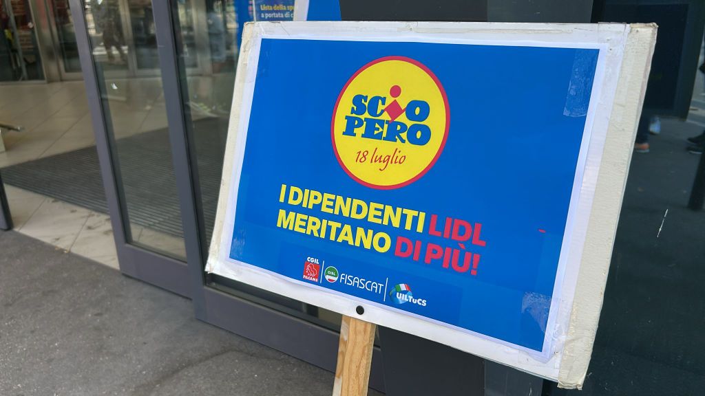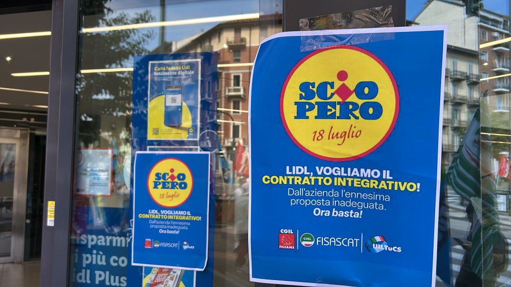 Sciopero nazionale di 8 ore per i dipendenti Lidl. A Torino il presidio è stato organizzato davanti al punto vendita di via Bologna 120 dalle sigle di Filcams, Fisascat e Uiltucs.