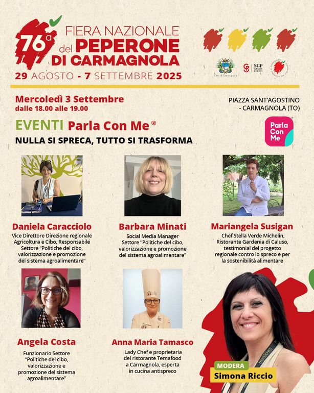 La 76ª Fiera Nazionale del Peperone di Carmagnola (29 agosto – 7 settembre 2025) ospiterà tre serate speciali del format Parla con Me Ⓡ, ideato e condotto da Simona Riccio (Digital Marketing Expert, Social Media Manager, LinkedIn Top Voice Italia, Founder Parla con Me Ⓡ).