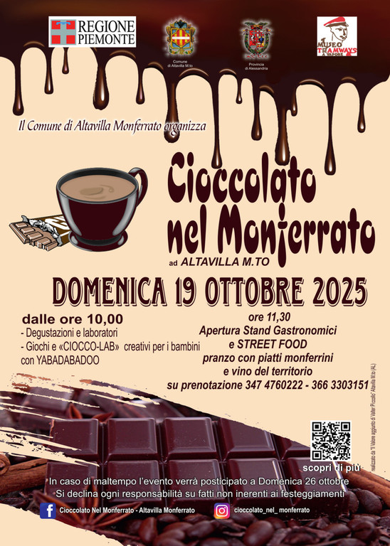 L'autunno nel Monferrato ha un sapore speciale, e quest'anno si arricchisce di una nota ancora più golosa e avvolgente. Il Comune di Altavilla Monferrato, con il patrocinio della Regione Piemonte e della Provincia di Alessandria, è lieto di presentare "Cioccolato nel Monferrato", un evento imperdibile per tutti gli amanti del cioccolato e delle tradizioni enogastronomiche piemontesi.