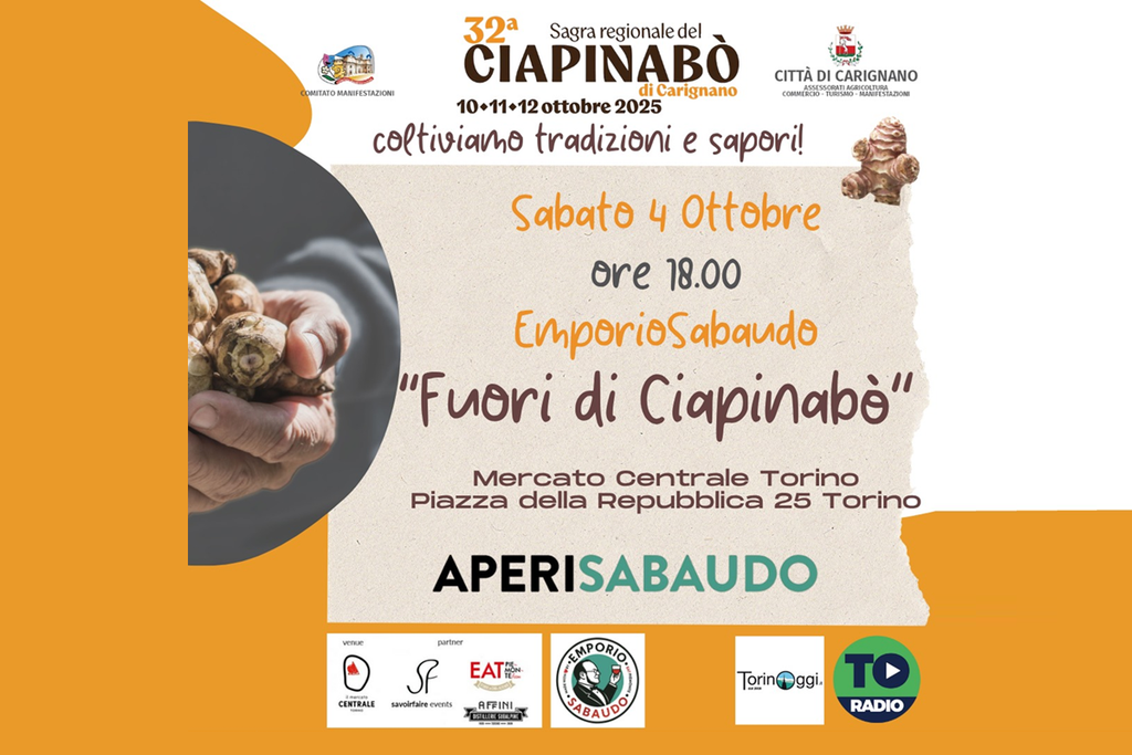 L'evento, intitolato "Fuori di Ciapinabò", si svolgerà Sabato 4 Ottobre dalle ore 18.00 presso l'Emporio Sabaudo all'interno del Mercato Centrale Torino, in Piazza della Repubblica 25. Sarà l'occasione per un Aperisabaudo all'insegna dei sapori che anticipano la sagra principale.