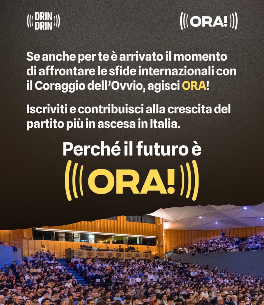 Il prossimo weekend, 10-11-12 ottobre, ad Abano Terme (Padova), l’associazione civico-politico Drin Drin compie il passo decisivo: il congresso fondativo che sancirà la nascita del nuovo partito ORA!. Un nome semplice e diretto, scelto per comunicare urgenza d’azione, concretezza e pragmatismo: l’idea che molte riforme “possano e debbano essere fatte adesso”, mettendo al centro competenze, numeri e responsabilità.