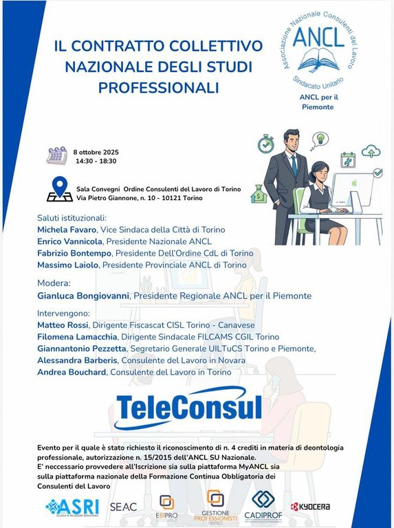 Si è svolto ieri, presso la sede dell’Ordine dei Consulenti del Lavoro di Torino, il convegno dedicato al Contratto Collettivo Nazionale degli Studi Professionali, promosso e organizzato da ANCL – Sindacato Unitario dei Consulenti del Lavoro.