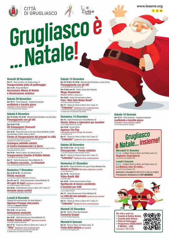 Il consiglio? Date uno sguardo al programma completo nella sezione "News & Eventi" del sito www.leserre.org e non perdetevi nemmeno una delle proposte. Troverete anche tutti gli appuntamenti di "Grugliasco è Natale… Insieme", "Grugliasco è Natale… Live" e “Grugliasco è Natale… in borgata”.