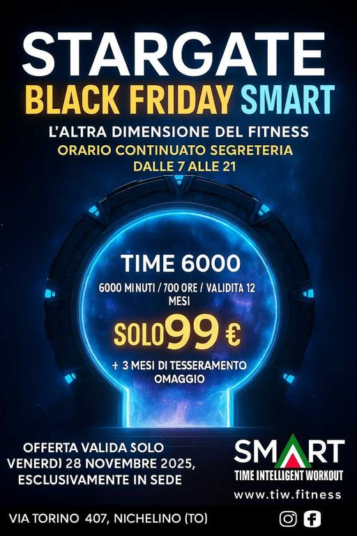 Sei pronto a varcare la soglia del fitness intelligente? SMART TIW - Time Intelligent Workout di Nichelino lancia una promozione "fuori dal tempo" per il Black Friday che è un vero e proprio viaggio dimensionale verso la tua forma fisica.
