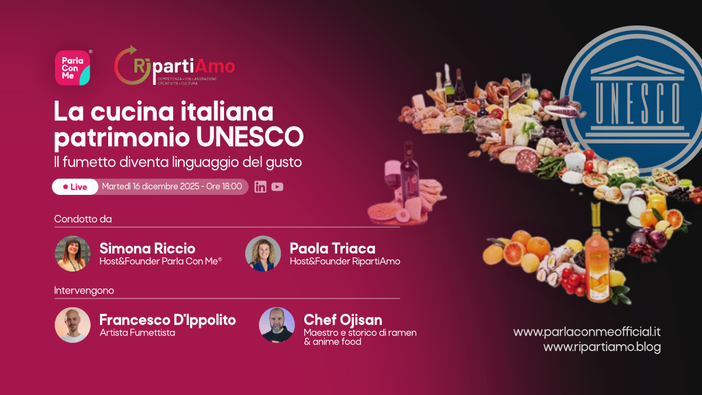 Ma come si racconta oggi questo patrimonio? E quali linguaggi possono renderlo vivo, accessibile e comprensibile anche alle nuove generazioni? A queste domande prova a rispondere la live condivisa Parla Con Me® × RipartiAmo, dal titolo: “La cucina italiana Patrimonio UNESCO – Il fumetto diventa linguaggio del gusto”, in programma: