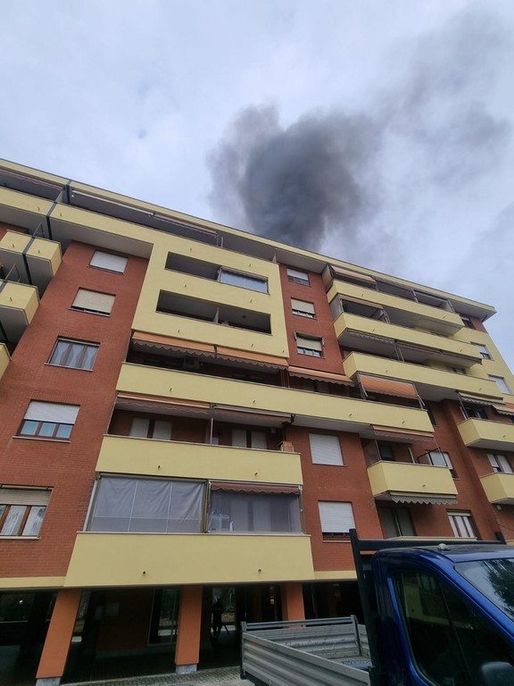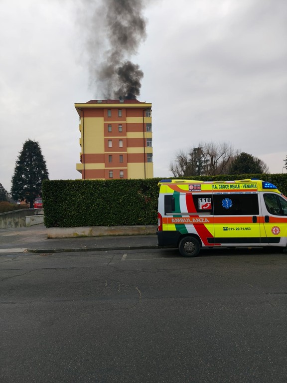 Mansarda in fiamme in via Salvemini n.10, a Venaria Reale. Questa mattina è divampato un rogo, che ha coinvolto l'ultimo piano della palazzina: sul tetto erano in corso dei lavori ed è presumibile che l'incendio sia partito da lì. L'alta colonna di fumo è visibile da distante.
