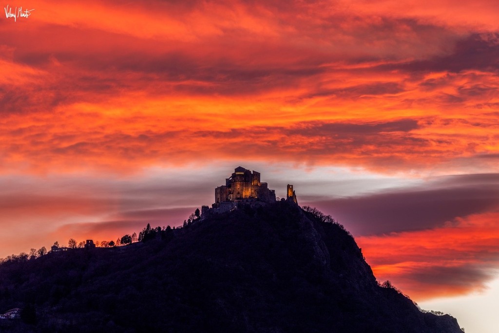 Dominato dalla Sacra di San Michele, il cielo della Val Susa si è trasformato in una tavolozza infuocata di sfumature. Il rosso e l’arancione hanno incendiato l’aria di questo scorcio di fine febbraio, creando un’atmosfera quasi surreale.