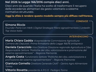 Proprio a questo tema sarà dedicato il panel “Legge 166: 10 anni contro lo spreco. E adesso?”, in programma sabato 15 marzo dalle 17.00 alle 18.30 nell’ambito di Horeca Expoforum, al Lingotto Fiere di Torino.